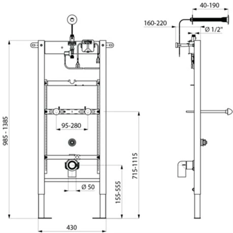 Bâti-support Tempofix 3 543100 version secteur plaque Tempomatic Delabie. Bâti-support avec plaque de déclenchement. Bâti en acier époxy noir à poser en applique. Fixation au sol et au mur porteur par ancrages fournis. Entraxe réglable de 100 à 280 mm. Châssis réglable en hauteur de 0 à 200 mm. Manchon d’évacuation à joint d’étanchéité Ø 50 mm. Livré prémonté. Conforme aux exigences de la norme NF D12-208. Compatible aux cloisons pleines de 40 à 190 mm. Détecteur de présence infrarouge antichoc. Distance de détection, temporisation et débit réglables à l’installation. Prévoir transformateur 230/12 V. Prise en compte après 3 secondes de présence. Possibilité de prérinçage automatique. Temporisation préréglée à ~3 secondes, ajustable de 3 à 12 secondes. Rinçage périodique hygiénique toutes les 24 h. Débit 0,3 l/sec à 3 bar, ajustable. Rosace affleurante. Tige filetée recoupable. Adapté aux PMR. Code EAN: 3456330172592