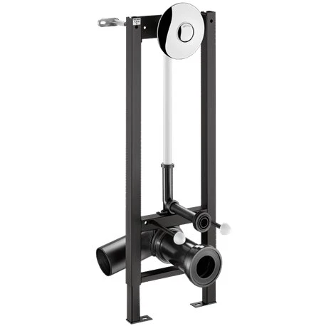 Bâti-support Tempofix 3 578300+578212 en applique simple touche Delabie, bâti en acier epoxy noir, châssis réglable en hauteur de 0 à 200 mm, livré prémonté, compatible aux cloisons de 10 à 35 mm, équipé de la plaque de déclenchement de chasse directe temporiséeTempoflux 2 (rosace en métal chromé diamètre 195 mm, déclenchement souple, robinet d’arrêt et de réglage de débit/volume). Version en applique pour fixation sur mur porteur. Code EAN: 3456330169424