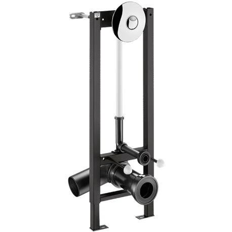 Bâti-support Tempofix 3 578300+578222 en applique double touche Delabie, bâti en acier epoxy noir, châssis réglable en hauteur de 0 à 200 mm, livré prémonté, compatible aux cloisons de 10 à 35 mm, équipé de la plaque de déclenchement de chasse directe temporiséeTempoflux 2 (rosace en métal chromé diamètre 195 mm, déclenchement souple, robinet d’arrêt et de réglage de débit/volume). Version en applique pour fixation sur mur porteur. Code EAN: 3456330169424