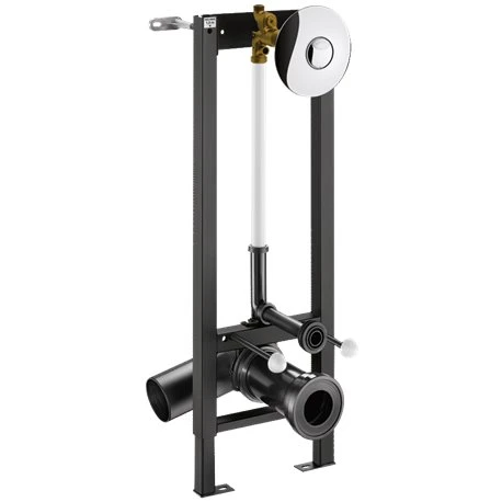 Bâti-support Tempofix 3 578300+578230 en applique double touche – cloison de 70 à 130 mm Delabie, bâti en acier epoxy noir, châssis réglable en hauteur de 0 à 200 mm, livré prémonté, compatible aux cloisons pleines semi-épaisse de 30 à 60 mm, équipé de la plaque de déclenchement de chasse directe temporiséeTempoflux 2 (rosace en métal chromé diamètre 195 mm, déclenchement souple, robinet d’arrêt et de réglage de débit/volume, double touche 3/6 L). Version en applique pour fixation sur mur porteur. Code EAN: 3456330169424