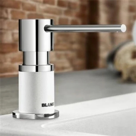 Distributeur de savon Lato Blanco en Silgranit. Distributeur facile à remplir par le dessus avec une contenance de 300ml. Coloris Blanc/chromé. Diamètre de 35mm pour la découpe. Référence : 525814. Code EAN : 4020684725071