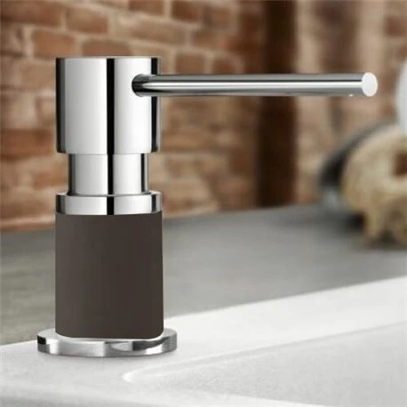 Distributeur de savon Lato Blanco en Silgranit. Distributeur facile à remplir par le dessus avec une contenance de 300ml. Coloris Café/chromé. Diamètre de 35mm pour la découpe. Référence : 525815. Code EAN : 4020684725088