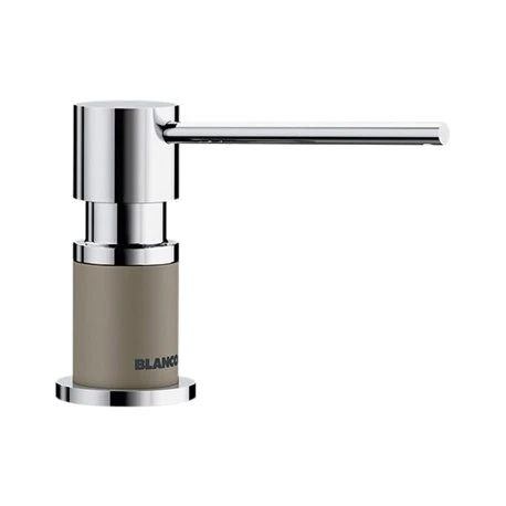 Distributeur de savon Lato Blanco en Silgranit. Distributeur facile à remplir par le dessus avec une contenance de 300ml. Coloris Tartufo/chromé. Diamètre de 35mm pour la découpe. Référence : 525816. Code EAN : 4020684725095