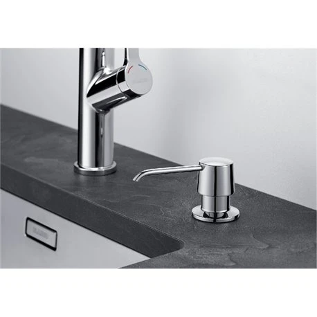 Distributeur de savon liquide Yano chromé de Blanco. Avec diamètre de 35 mm pour la découpe, de référence: 524256, contenance: 300 ml. Surface métallique, facile à remplir par le dessus. Code EAN: 4020684127486.