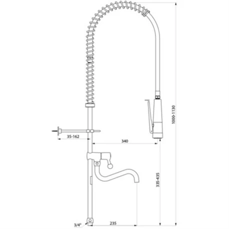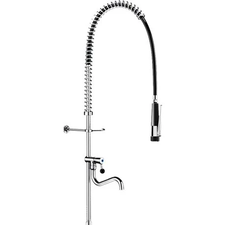 Robinet cuisine Combiné de prélavage 435722 douchette antitartre à picots avec colonne longue et bec tube Delabie. Avec colonne 3/4 » en laiton comprenant un robinet de puisage avec un bec tube orientable L. 200 mm, une tête à clapet à mécanisme renforcé avec manette ergonomique, une douchette antitartre noire M1/2 à jet réglable, flexible armé L. 0,95 m noir qualité alimentaire, collier mural réglable, ressort-guide inox.