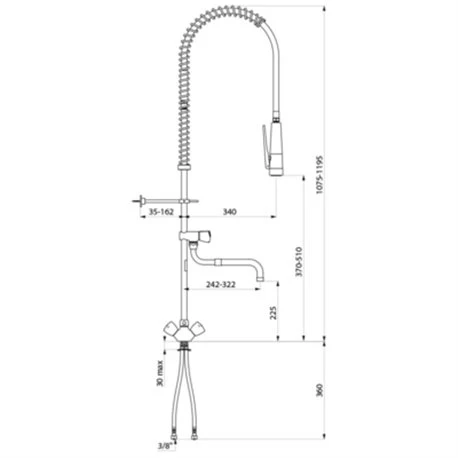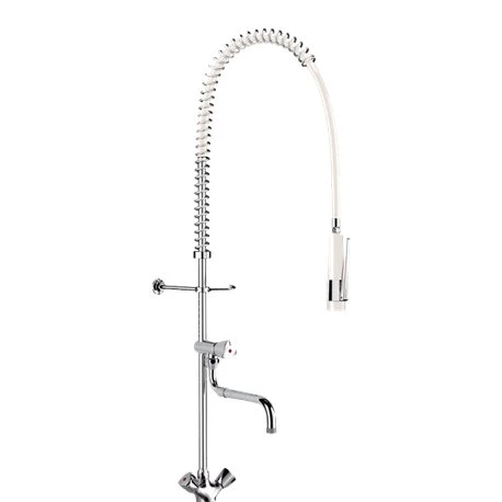 Robinet cuisine Combiné de prélavage monotrou avec mélangeur G6932 douchette antitartre à picots avec robinet de puisage Delabie. Complet avec colonne 3/4 » en laiton, mélangeur monotrou sur plage avec tête à clapet avec croisillon, fournis avec raccords flexibles F3/8 et clapets antiretour, douchette antitartre blanche M1/2 à jet réglable, robinet de puisage avec bec télescopique orientable L 200-290 mm, tête à clapet à croisillon, flexible armé L. 0,95 m blanc qualité alimentaire, collier mural réglable, ressort-guide inox. Douchette ergonomique 2 jets (jet pluie et jet concentré). Code EAN : 3456330189316.