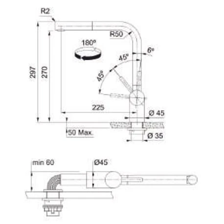 Mitigeur cuisine escamotable à douchette monojet extractible inox référence 444910 de Franke, Atlas Néo solution fenêtre, flexible de douchette tressé, hauteur sous fenêtre minimum 60 mm, rotation du bec sur 180°, embase Ø45 mm, perçage Ø35 mm, débit 8,2 L/min, 3 bar, hauteur 297 mm, code EAN: 7612985444910. Ecoulement laminaire, système de fixation à corps fileté. Code FUN: 115.0521.439.