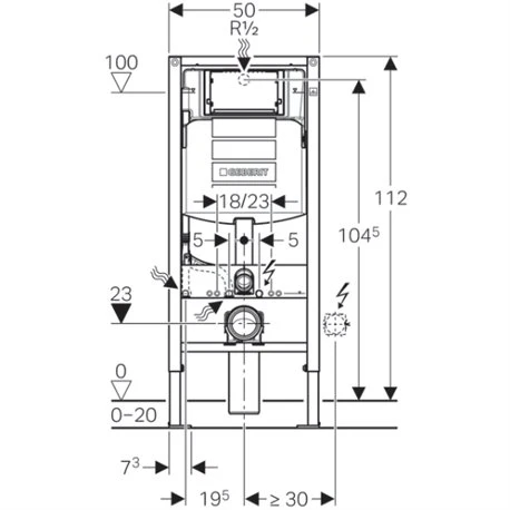 Bâti-support Geberit Duofix pour WC suspendu, 112 cm, avec réservoir à encastrer Sigma 12 cm. Livré avec : arrivée d’eau, avec robinet équerre et volant intégrés, boîtier de réservation pour trappe de visite, fixations murales, bouchons de protection, kit de raccordement, coude de raccordement, tiges filetées, goujons d’ancrage et matériel de fixation. Référence : 111.303.00.5. Code EAN : 4025416857693.