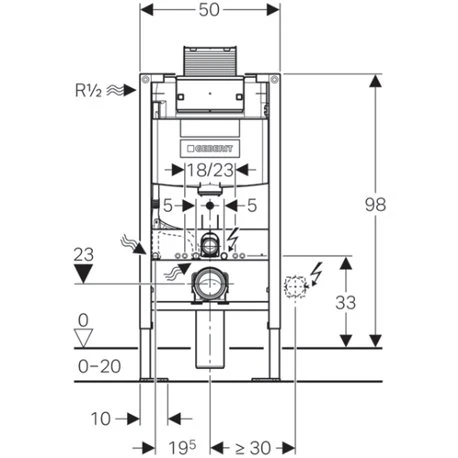 Bâti-support Geberit Duofix pour WC suspendu, 98 cm, autoportant, avec réservoir à encastrer Omega 12 cm. Livré avec : arrivée d’eau, avec robinet équerre et volant intégrés, boîtier de réservation pour trappe de visite, 2 fixations murales, kit de raccordement pour WC, coude de raccordement 90° en PVC, 2 vouchons de protection, 2 tiges filetées M12, 6 goujons d’encrage M8, matériel de fixation. Référence : 111.035.00.1. Code EAN : 4025416319689.