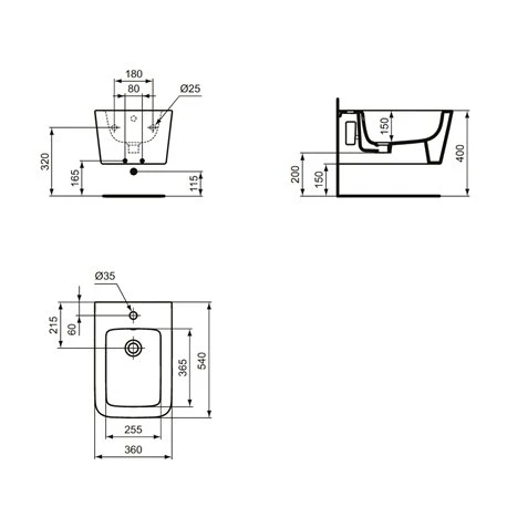 Bidet suspendu Blend Cube Blanc Brillant Ideal Standard. En grès fin. Dimensions (HxlxP) : 250x360x540 mm. Référence : T368701. Code EAN : 8014140467557.