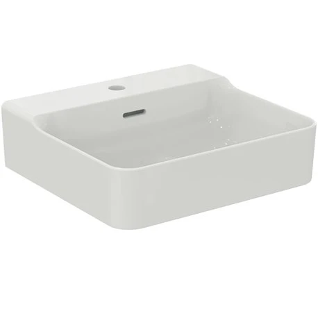 Lavabo Conca Ideal Standard. Dimensions (LxlxH) : 450x500x125 mm. Avec trop plein et plage de robinetterie. Lavabo blanc en grès fin à poser ou à fixer au mur. 1 trou percé. Référence : T369001. Code EAN : 8014140457909