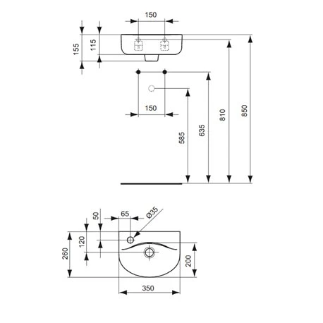 Lave-mains Arc Connect Ideal Standard. Dimensions (Lxlxh) : 350x260x155 mm. Fixation murale par 2 tire-fonds non-fournis. Percé 1 trou à gauche. Référence : E791201. Code EAN : 5017830389422