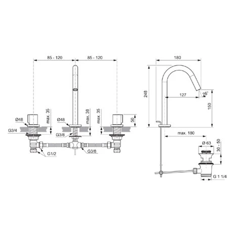 Ideal Standard Mélangeur Lavabo Joy Gris Orage 3 Trous Avec Tirette Et Vidage Bonde Métal