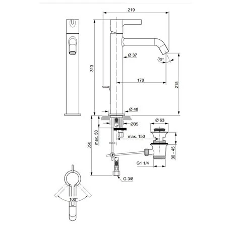 Mitigeur lavabo monotrou BC781AA Joy réhaussé, chrome, tirette Ideal Standard. Bec fixe avec aérateur avec limiteur de débit max 5L/min, cartouche diamètre 28 mm avec limiteur de température, système de fixation rapide Easy-Fix, hauteur sous aérateur 215 mm, projection 170 mm. Code EAN: 3800861086079