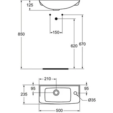 Lave-mains Ulysse Porcher. Dimensions (Lxlxh) : 500x235x125 mm. Fixation murale par 2 tire-fonds non-fournis. Lave-mains en porcelaine vitrifiée. Percé 1 trou pour la robinetterie. Référence : P169101. Code EAN : 3391500294479