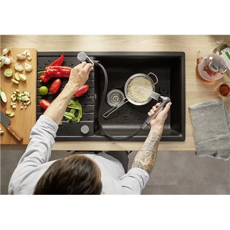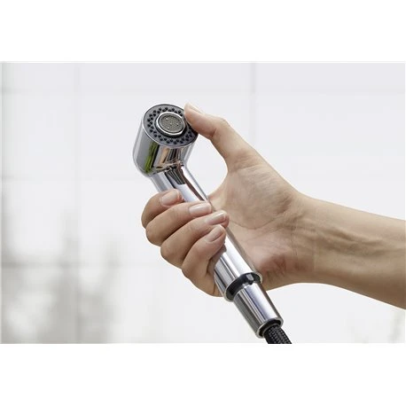 Mitigeur de cuisine Blancowega-S II réf 526416 de Blanco, coloris Chromé. La hauteur du mitigeur est de 177 mm et procure un débit de 9,23 L/min. Mitigeur à levier supérieur pour une plus grande facilité d’utilisation et un aménagement flexible de la cuisine. Douchette extractible double jet : passage facile du jet pluie aéré au jet de rinçage puissant. Convient particulièrement aux éviers et cuves compacts. Bec orientable à 180°. Équipé de série d’un clapet anti-retour, donc intrinsèquement sûr en matière de retours d’eau suivant la norme EN 1717. Code EAN: 4020684742368