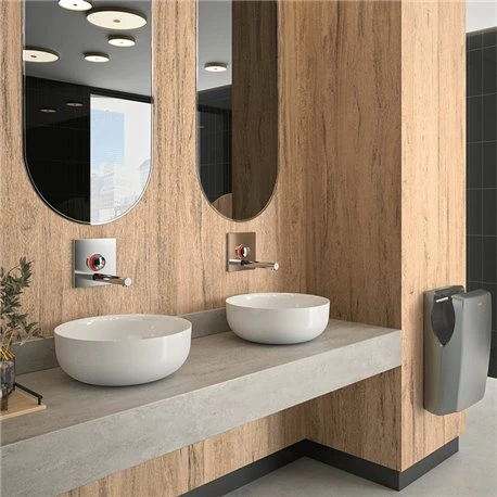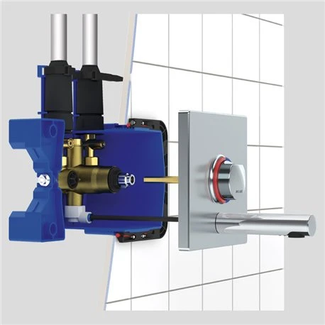 Mitigeur temporisé 794BOX3+794200 Tempomix 3 bec L. 110 mm Delabie, plaque en métal chromé 160×160 mm inviolable, boîtier d’encastrement étanche, réglage de la température et déclenchement sur le croisillon, butée de température max réglable, déclenchement souple, temporisation ~7 sec, débit préréglé à 3 L/min à 3 bar, brise-jet antitatre, bec à intérieur lisse et à faible contenance. Code EAN: 3456330167871