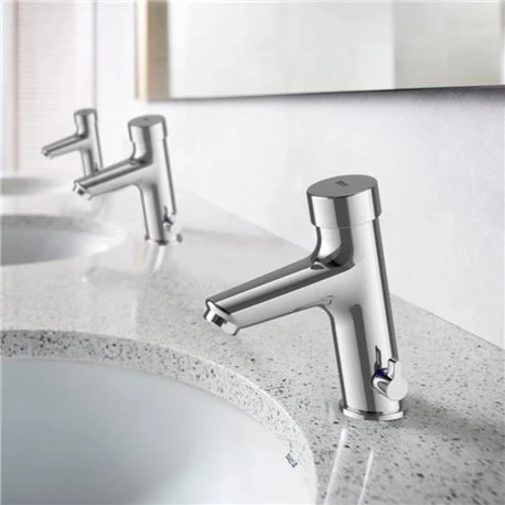 Robinet de lavabo Fluent référence A5A4B24C00 coloris Chromé de Roca. Mitigeur mitigeur temporisé pour lavabo 2 L/Min. Il mesure (Hxp): 111×111 mm. Code EAN: 8433290136654